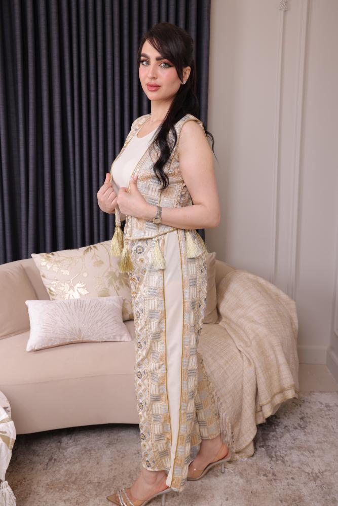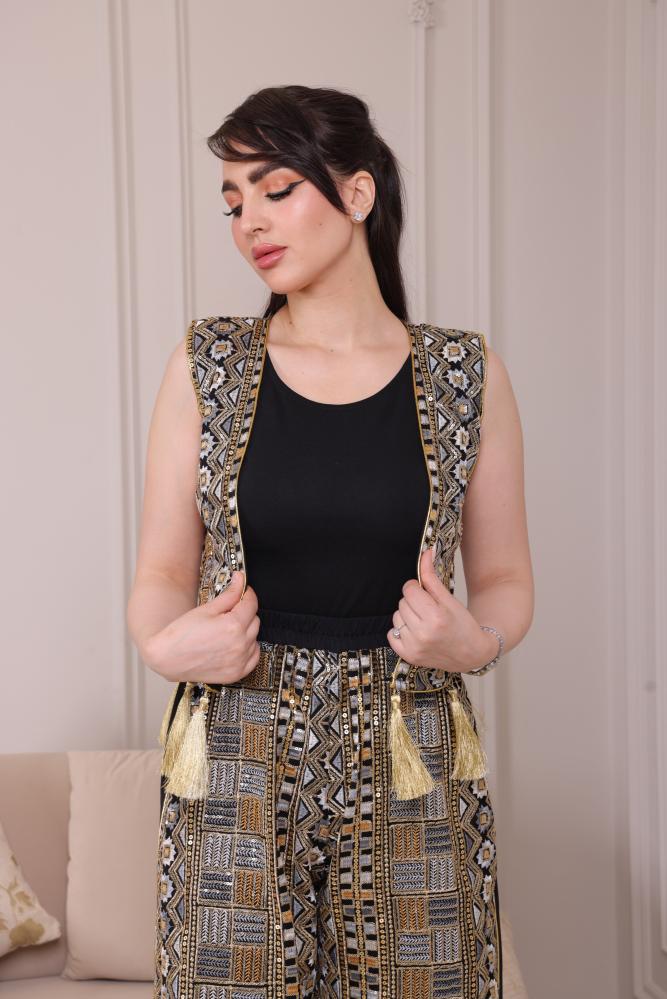 • طقم تراثي عصري مكون من 3 قطع: بنطال واسع، توب أساسي، وصديرية مفتوحة مزينة بشراشيب ذهبية فاخرة.