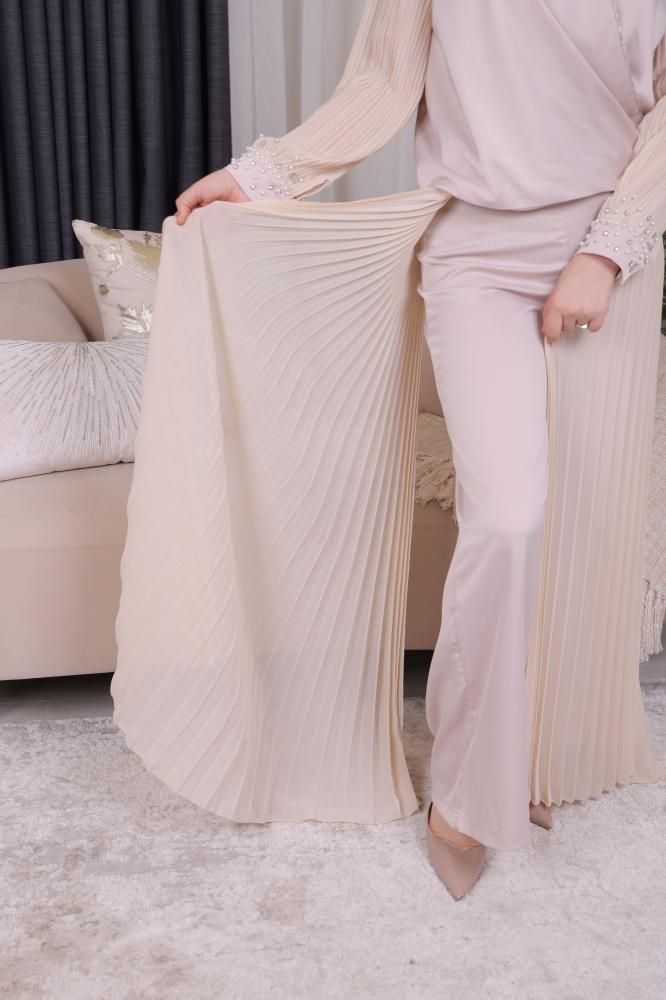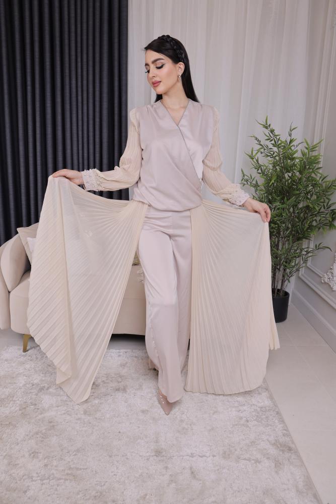 • البنطال: تصميم كلاسيكي واسع مع تفاصيل مطرزة تضفي لمسة فخامة