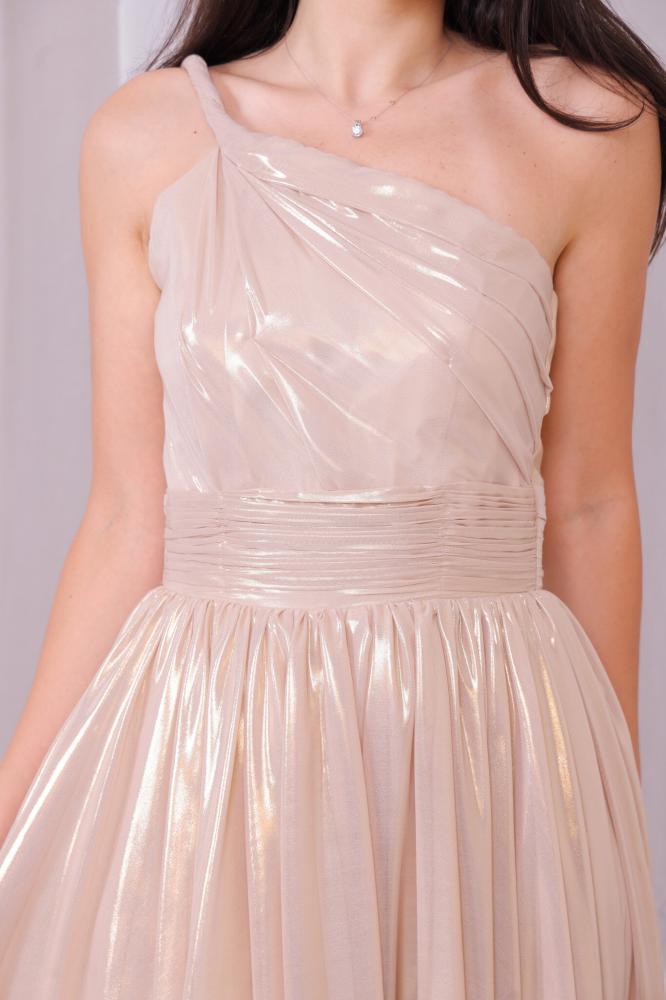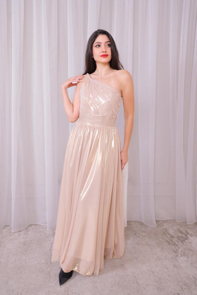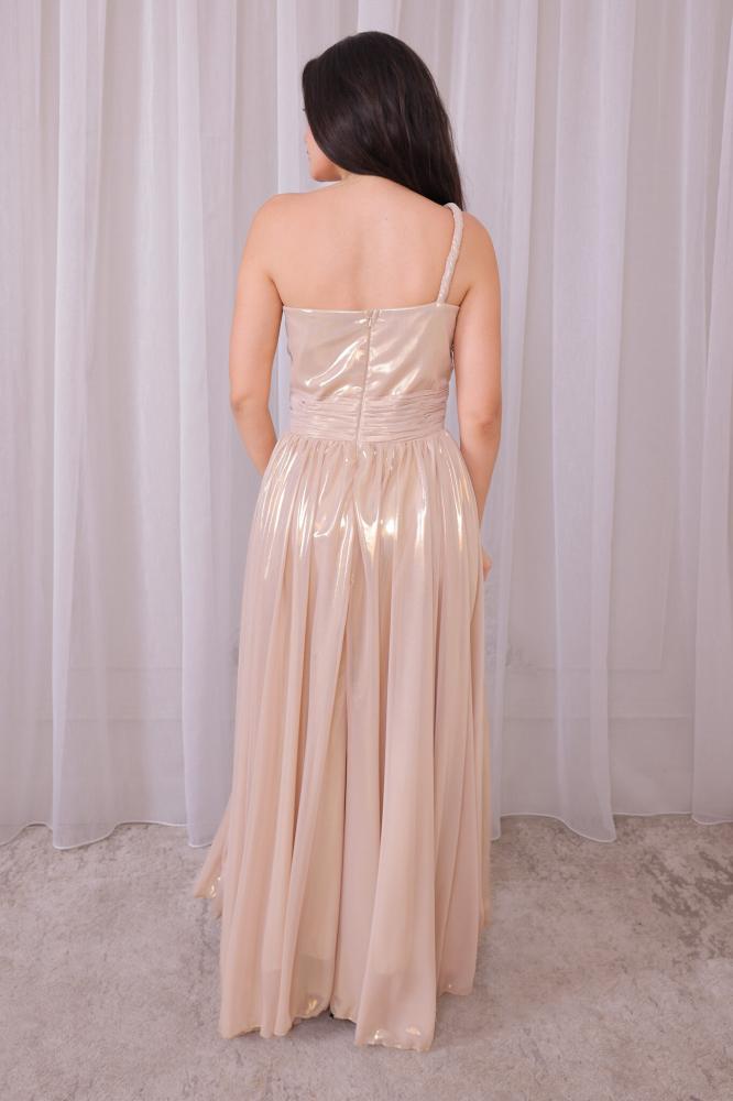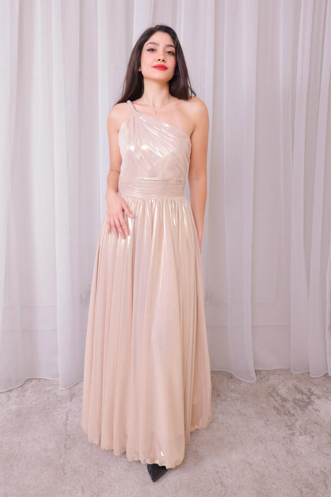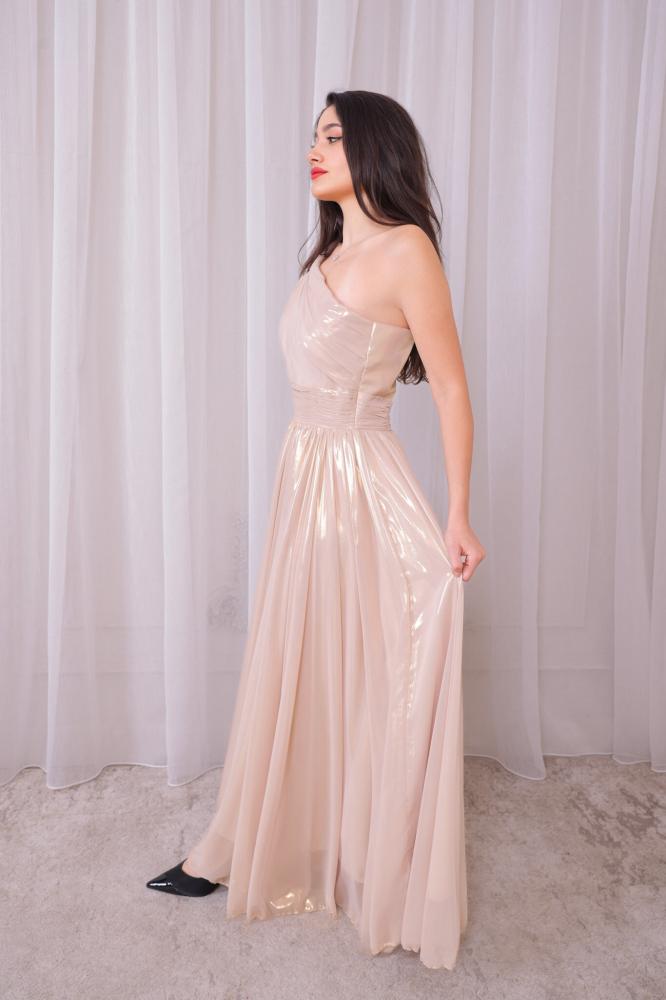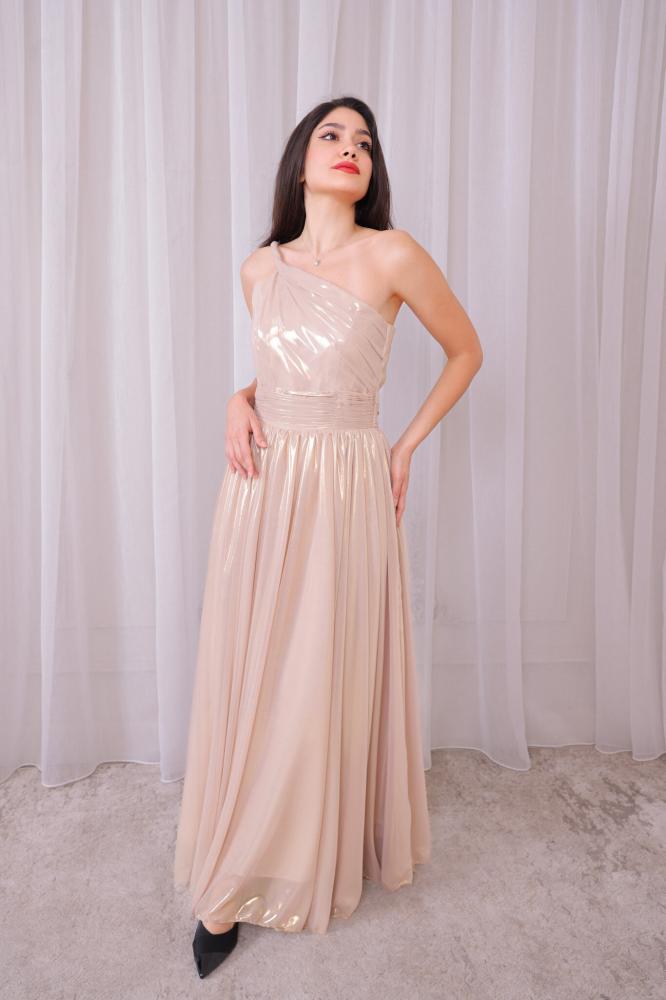 فستان طويل بلون بيج لامع يناسب السهرات والمناسبات الفاخرة.