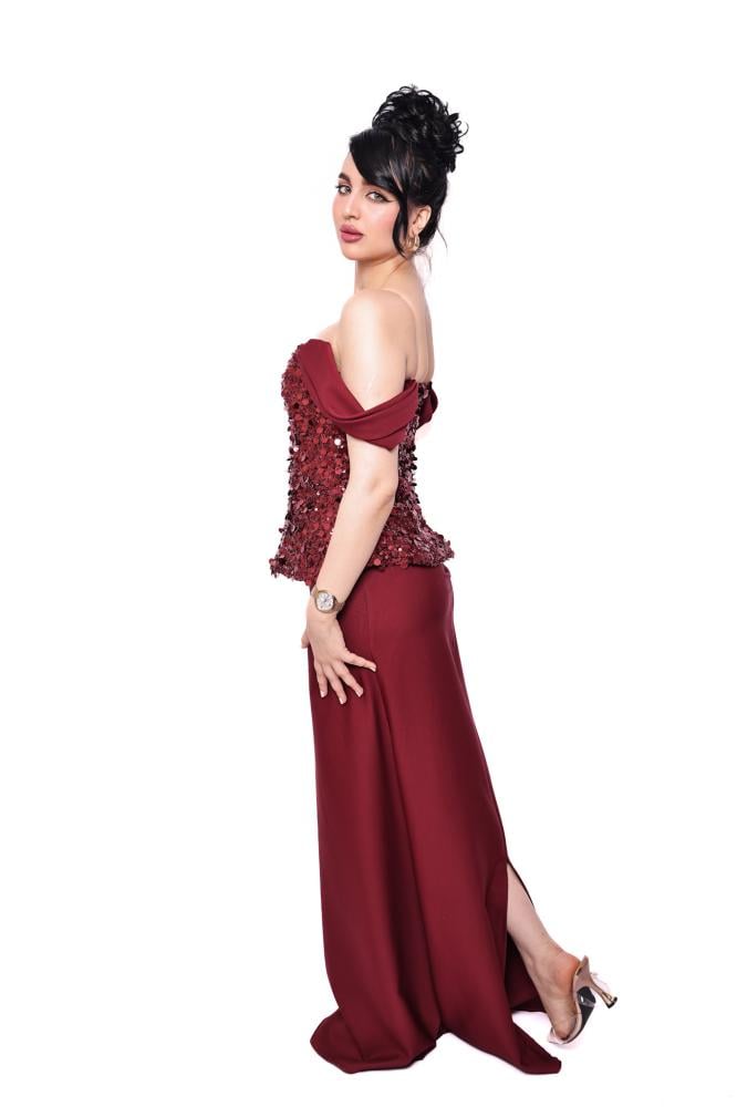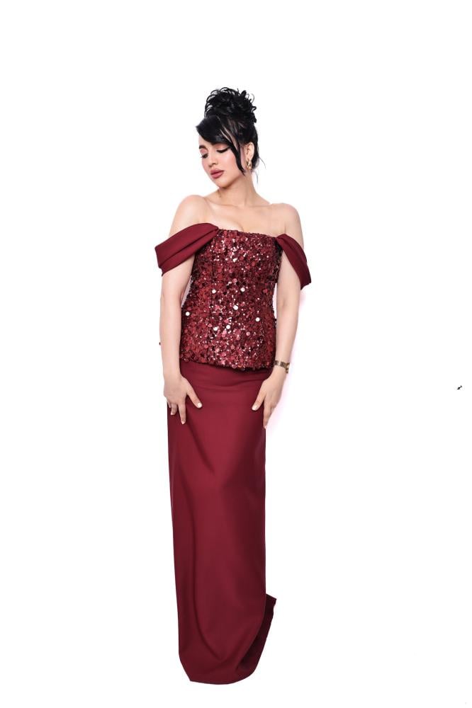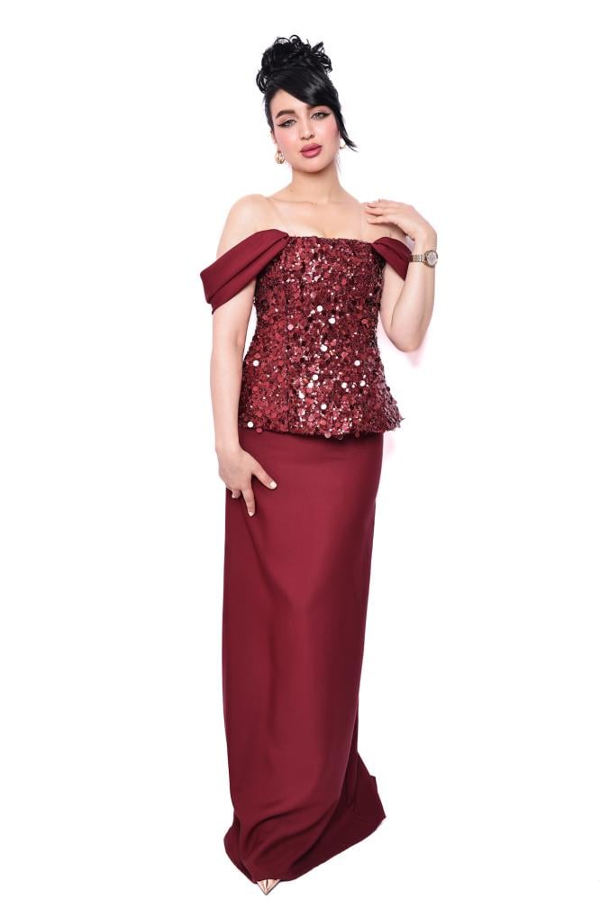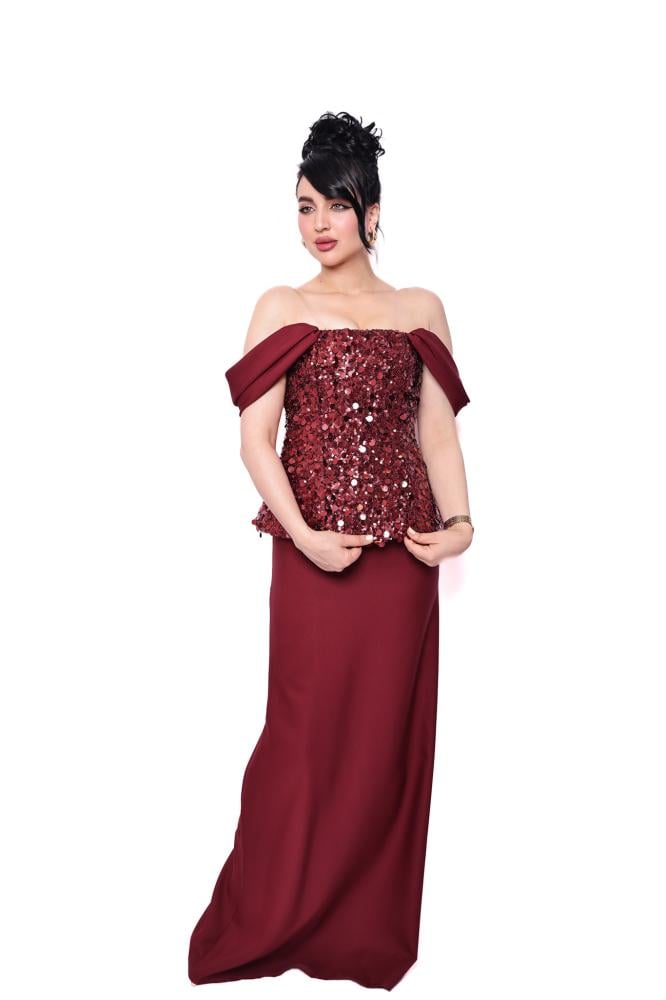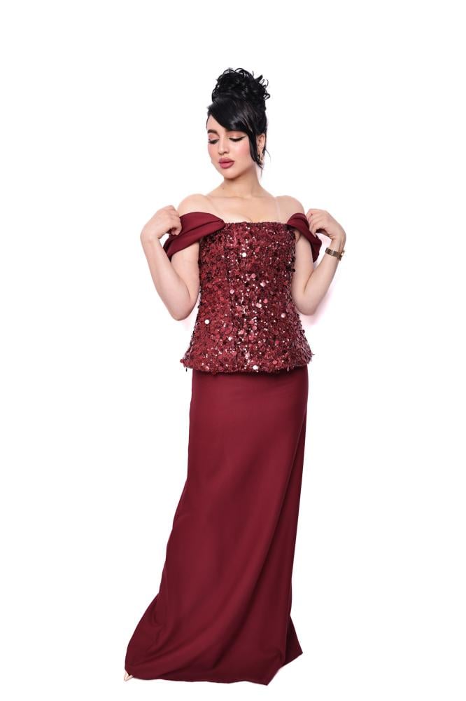 • الجزء العلوي مطرز بالكامل بالترتر اللامع بدرجات الأحمر والخمري لإطلالة متألقة.