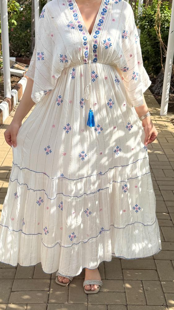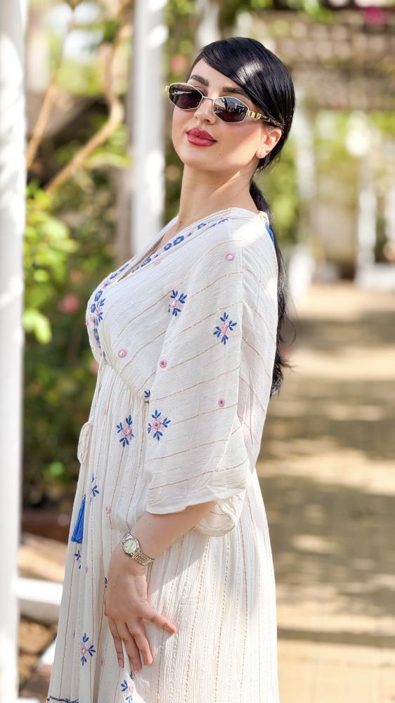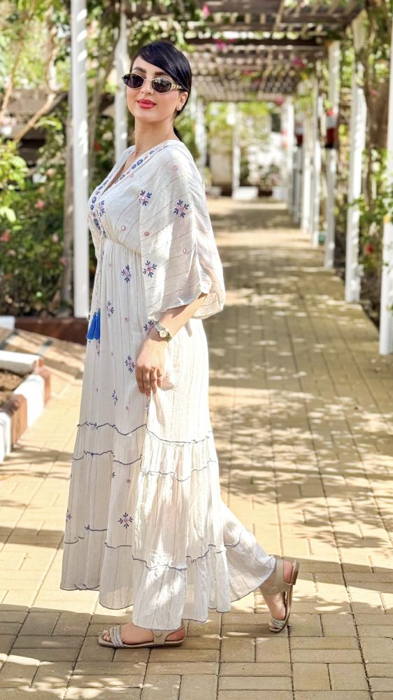 يأتي باللون الأبيض مع تطريز دقيق بألوان دافئة، مما يضيف لمسة من الأناقة.