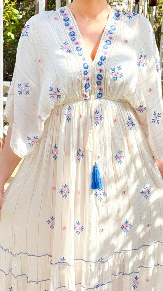 فستان صيفي طويل بأكمام واسعة مع تفاصيل ناعمة تجعل الإطلالة أكثر أنوثة.