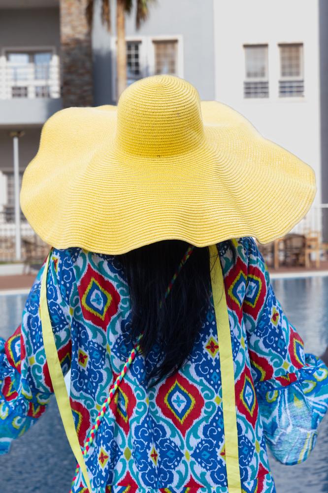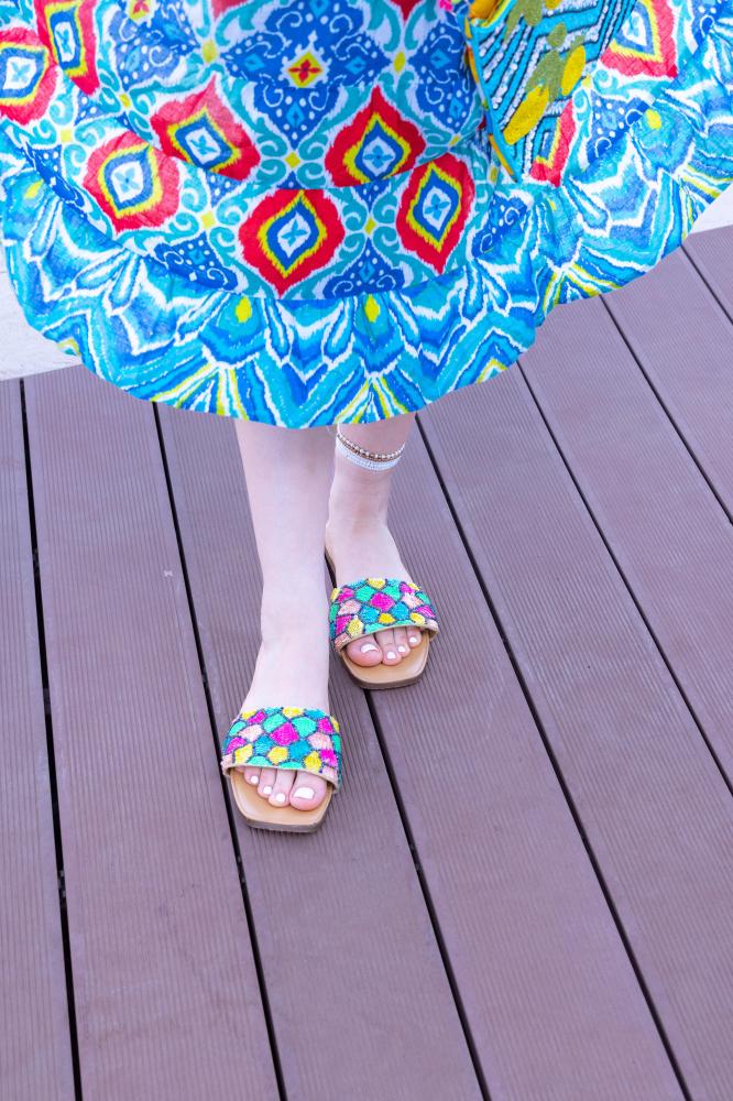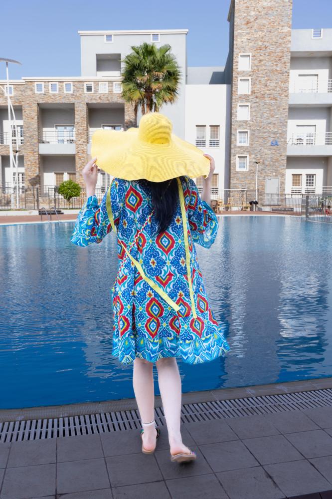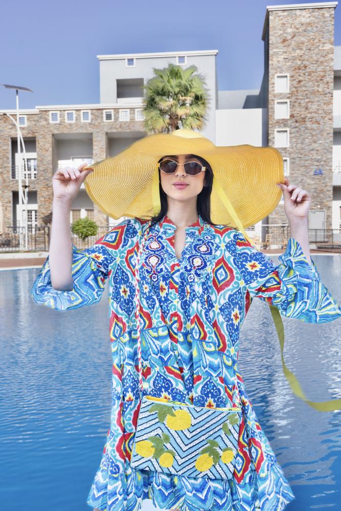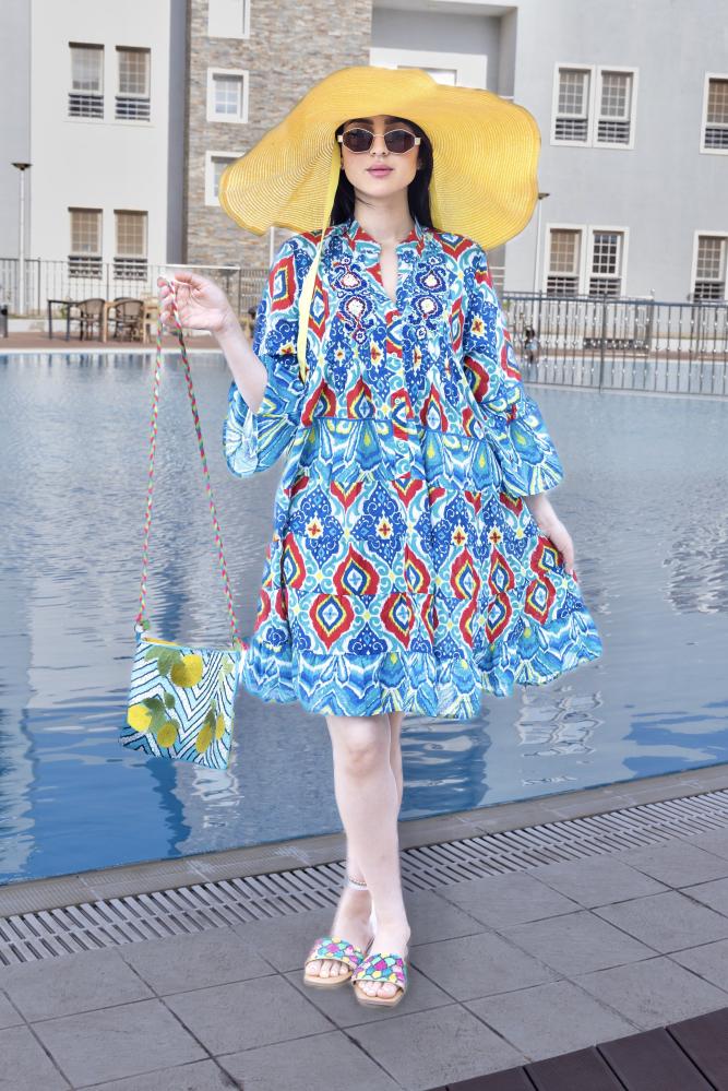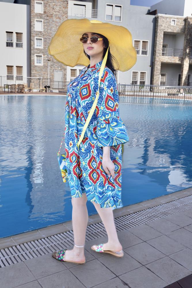 فستان صيفي قصير بتصميم عصري وأنيق، يتميز بنقوش ملونة وحيوية تجمع بين الألوان الزرقاء والحمراء والأصفر، مما يضفي مظهرًا منعشًا وجذابًا. الفستان يأتي بأكمام واسعة ومريحة، مما يجعله مثاليًا للطقس الحار والمناسبات الصيفية غير الرسمية. تنسيق الفستان مع حقيبة ملونة، قبعة واسعة من القش الصفراء، ونظارات شمسية تجعل من هذا اللوك خيارًا مثاليًا للذهاب إلى الشاطئ أو الاسترخاء بجانب المسبح.