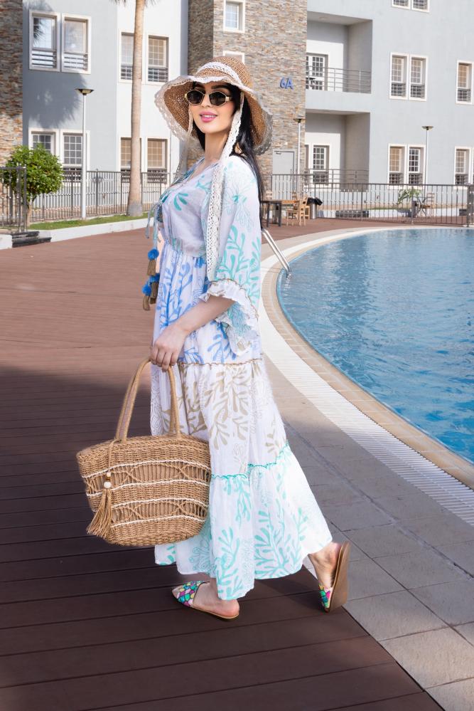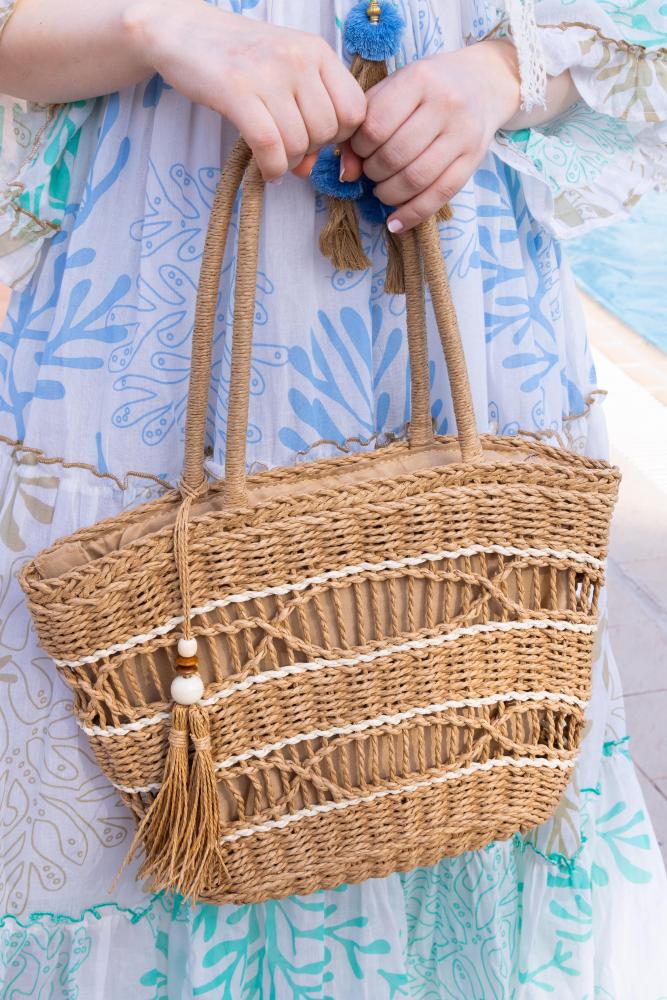 حقيبة شاطئية مصنوعة من الخيزران بتصميم عملي وأنيق، مع تفاصيل زخرفية من الشرائط البيضاء وكرة خيطية. تتميز بمقابض متينة، مما يجعلها مثالية للاستخدام اليومي أو الذهاب إلى الشاطئ