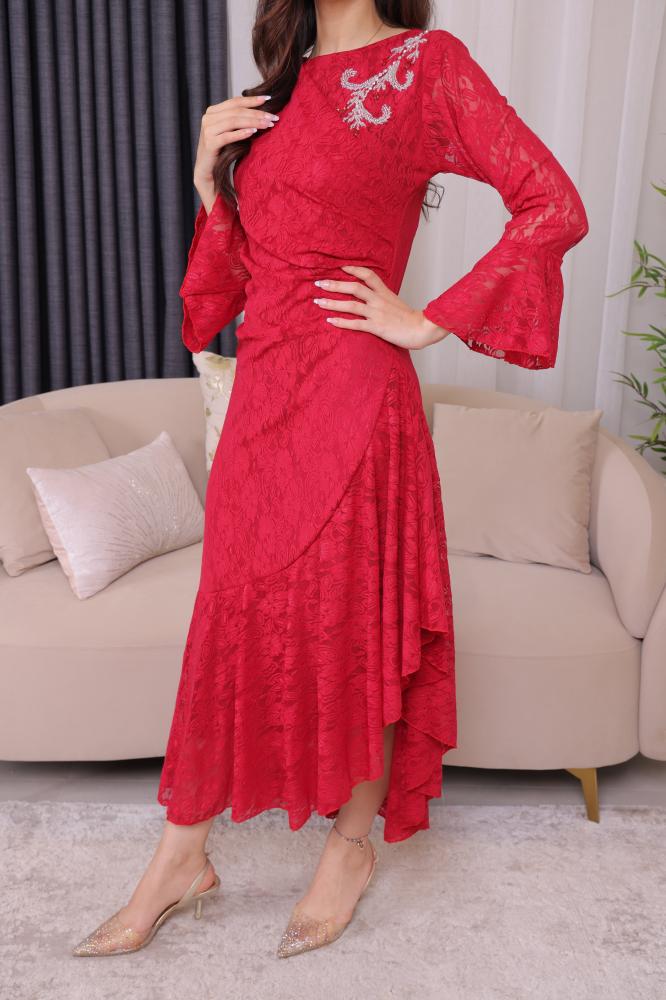وصف المنتج: فستان سهرة أنيق باللون الأحمر المصنوع من قماش الدانتيل الفاخر الذي يضفي مظهرًا رقيقًا وفخمًا. يتميز الفستان بأكمام طويلة من الدانتيل مع تفاصيل من الكشكشة عند الأطراف، مما يضيف لمسة من الأنوثة. تصميم الفستان يأتي مع تطريز جميل على الصدر يبرز جماله، كما أن القصة المتدرجة من الأسفل تضفي حركة إضافية على الفستان وتجعله مناسبًا للمناسبات الخاصة. الخصر المشدود يبرز منحنيات الجسم، فيما تتميز التنورة بنعومة وانسيابية، مما يجعل الفستان خيارًا مثاليًا للمناسبات الرسمية أو السهرات الراقية.