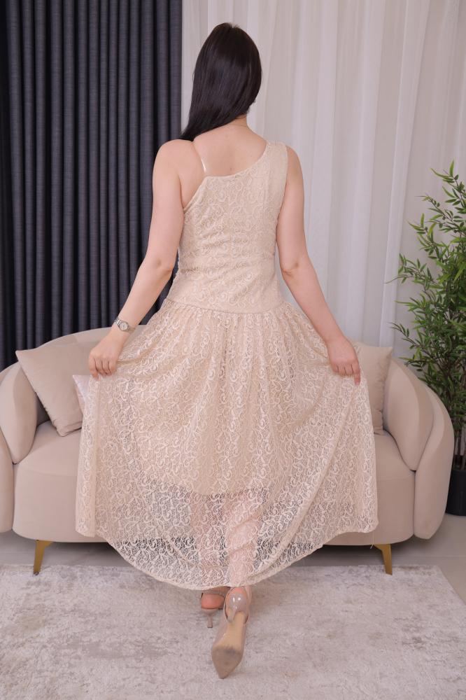 وصف المنتج: فستان سهرة أنيق باللون البيج، يتميز بتصميم بسيط ورقيق. الفستان ذو حواف ناعمة وتفاصيل تطريز خفيفة، مما يعطيه مظهرًا أنثويًا ناعمًا. يتميز الفستان بوجود حزام رفيع حول منطقة الخصر مما يعزز من جمال القصة. يأتي الفستان بتصميم طويل يصل إلى الركبة مع تنورة متدرجة تضيف حركة وأناقة. هو اختيار مثالي للمناسبات الخاصة كالحفلات أو السهرات حيث يجمع بين البساطة والفخامة.