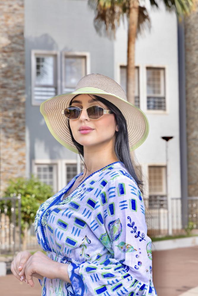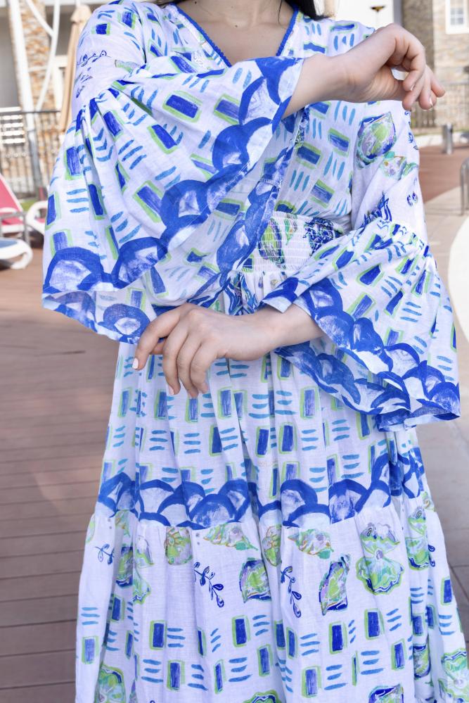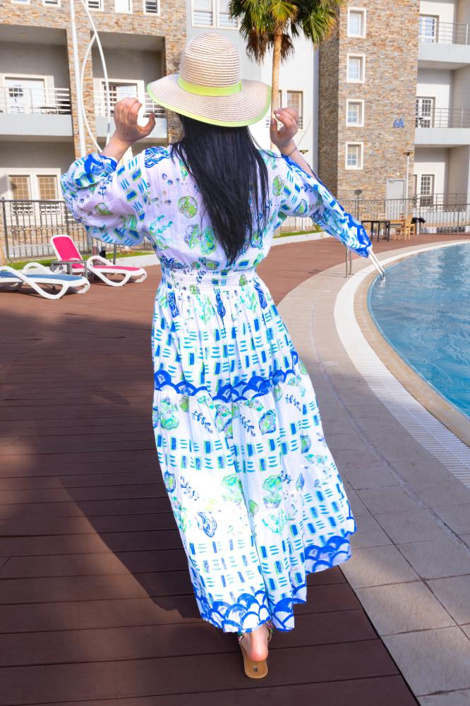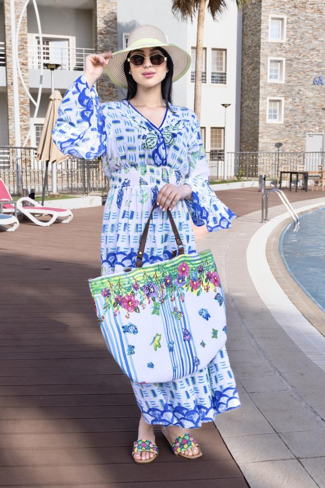 فستان صيفي طويل بتصميم عصري وألوان زاهية تجمع بين الأبيض والأزرق مع تفاصيل نباتية، مما يعطي الفستان مظهرًا منعشًا وجذابًا. الفستان مزين بأكمام واسعة تضيف لمسة من الأناقة، مما يجعله مثاليًا للطقس الحار والمناسبات الصيفية غير الرسمية.