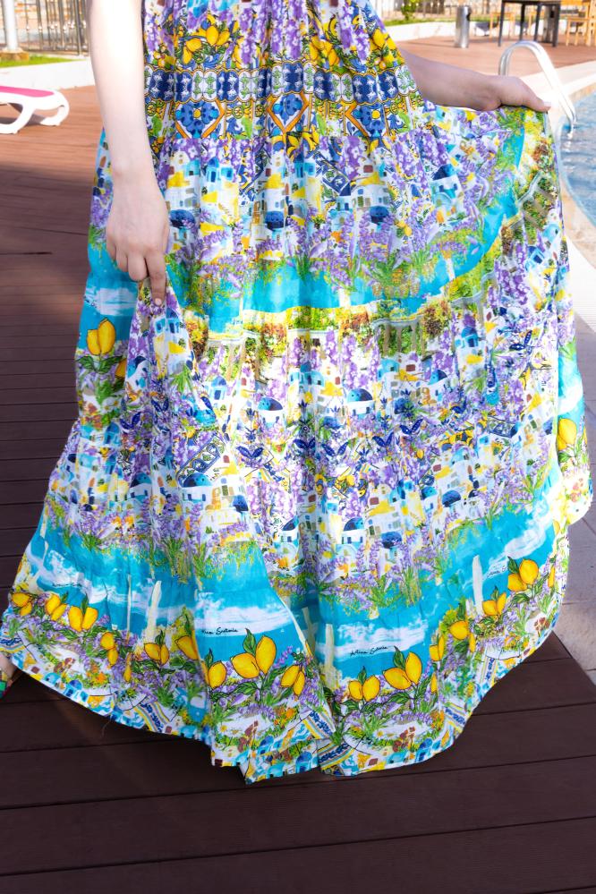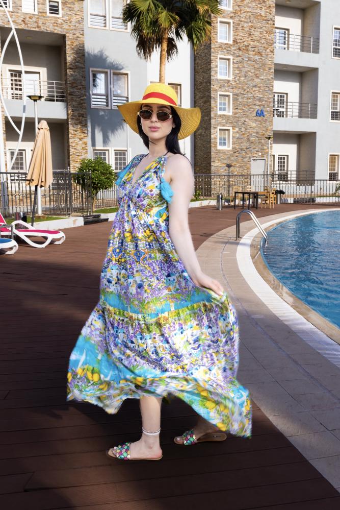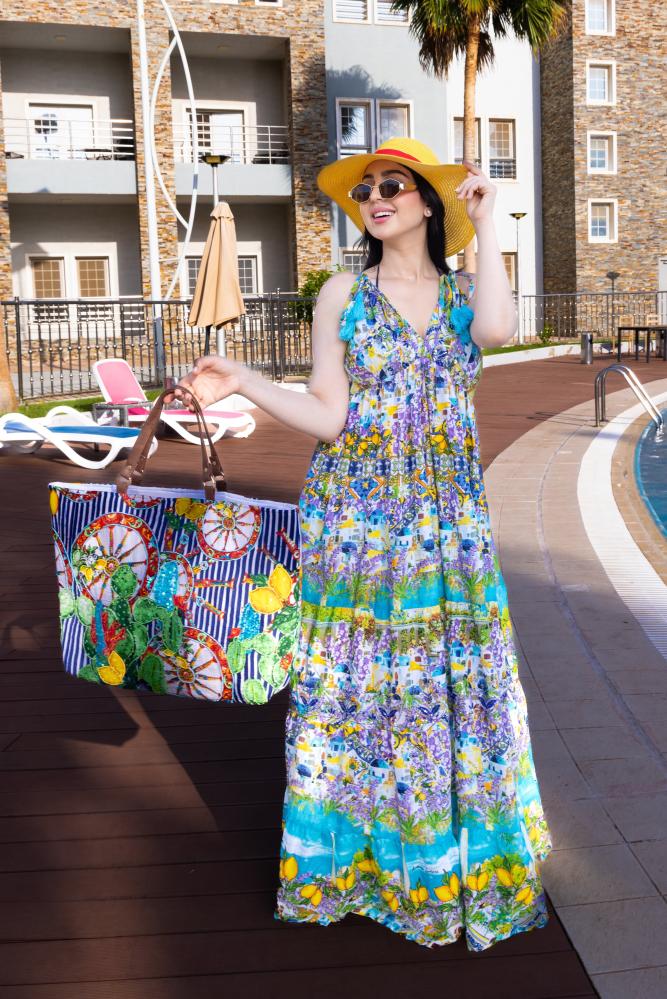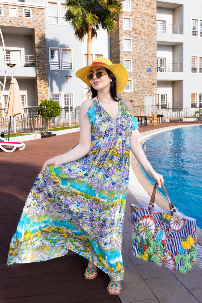 فستان صيفي طويل بتصميم عصري وألوان زاهية، مزخرف بنقوش استوائية ملونة تشمل الأزهار والنباتات. الفستان يتميز بألوان مبهجة مثل الأزرق والأصفر والأخضر، مما يضفي مظهرًا منعشًا وحيويًا. مع الأكمام الواسعة والرقبة المفتوحة، يقدم الفستان إطلالة مريحة وأنيقة، مثالي للأجواء الصيفية والمناسبات الشاطئية.