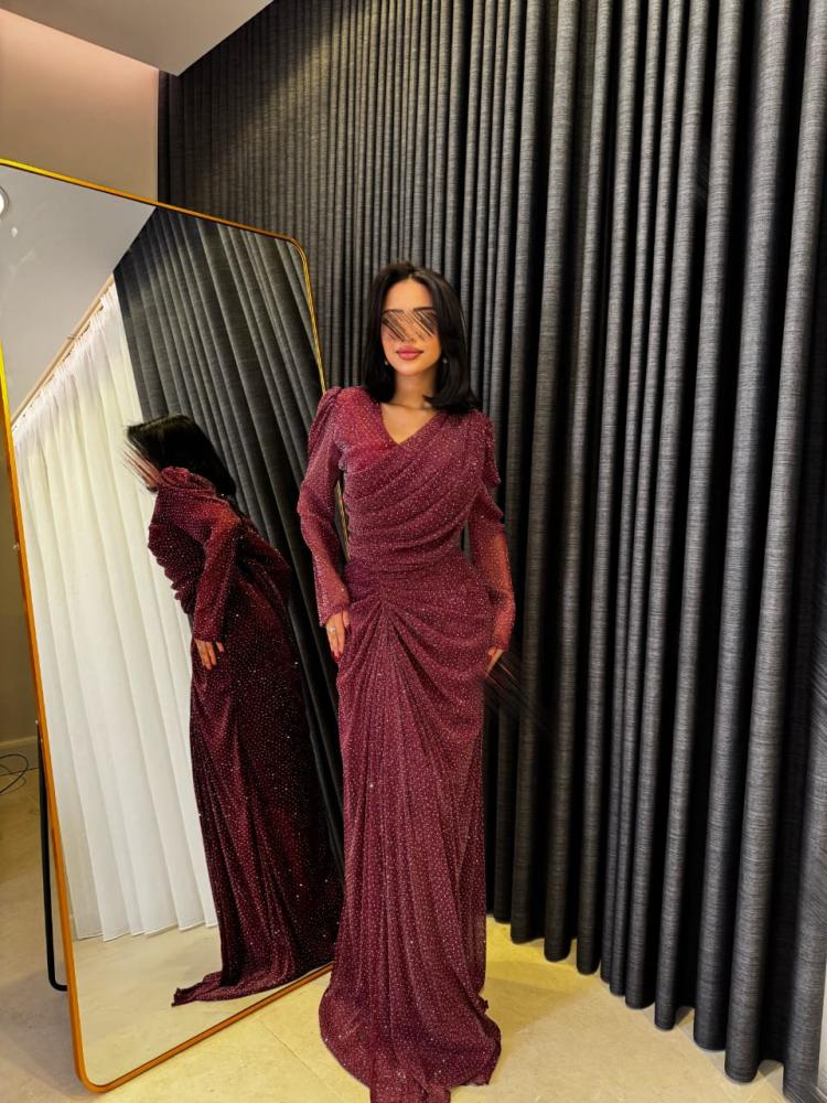 فستان طويل بأكمام طويلة مصنوع من قماش لامع بلون خمري (ماروني) أنيق.
