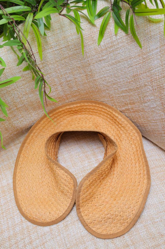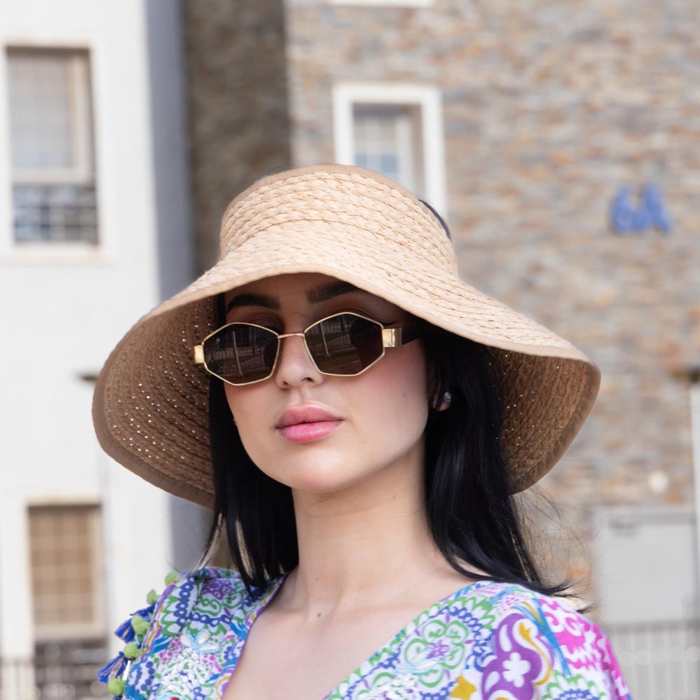 قبعة قش واسعة مصممة بلون بيج طبيعي مع حواف عريضة توفر حماية فعالة من الشمس. تتميز بتصميم بسيط وأنيق يجعلها مثالية للأجواء الصيفية والتوجه إلى الشاطئ أو الاسترخاء في الهواء الطلق.