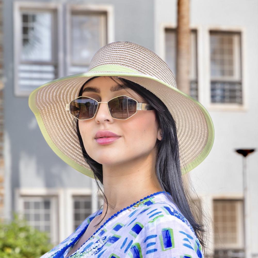 قبعة قش ذات حواف واسعة بلون طبيعي، مزينة بشريط أخضر فاتح حول الحواف. تصميمها العصري يجعلها مثالية لحماية الرأس من الشمس، مما يضفي مظهرًا مريحًا وأنيقًا، وهي خيار مثالي للأجواء الصيفية والمناسبات الشاطئية