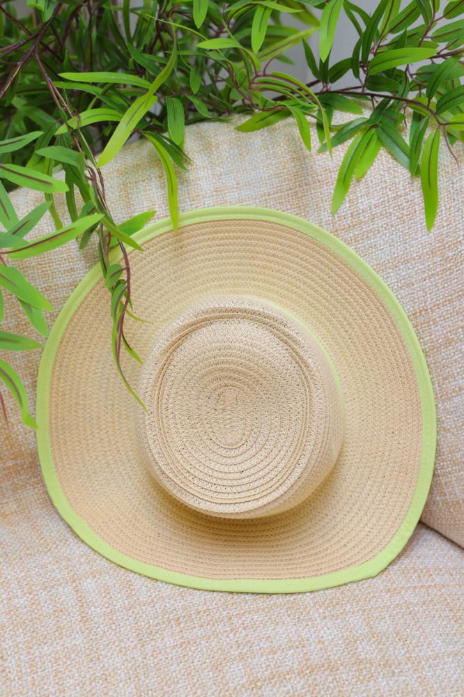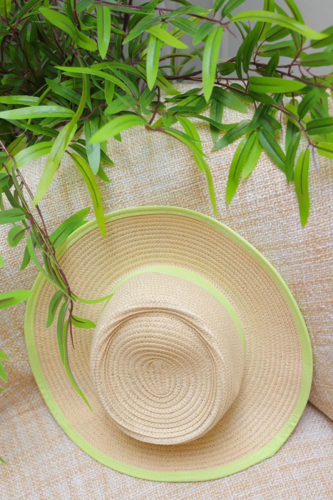 قبعة قش واسعة مع شريط أخضر بتصميم عصري